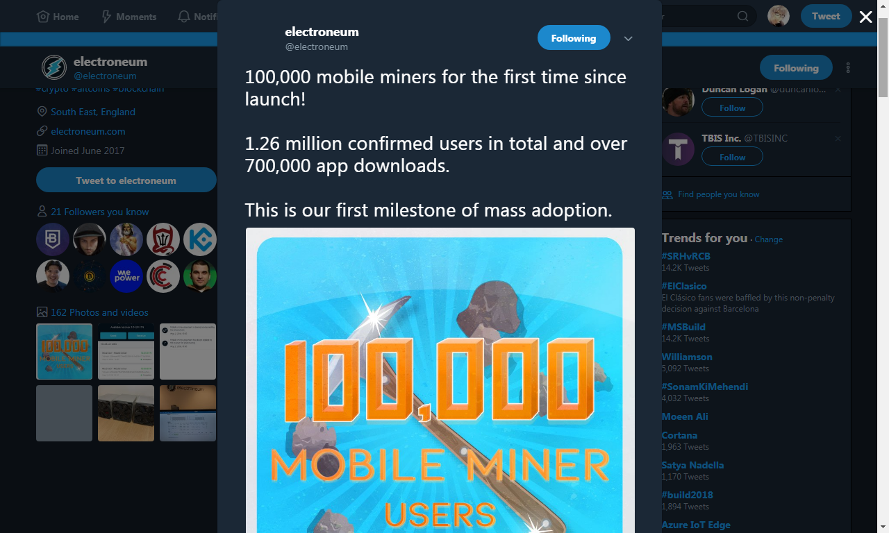 Just a few days ago Electroneum tweeted saying they've crossed 100,000 mobile miners for the first time since their launch.