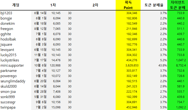 11월 자이언트 토큰 분배minigame (70)admin벌써 일년in mini.topia • 5 years ago 11월 자이언트 토큰을 아래와 같이 분배 합니다. 12월 토큰 분배는 기 안내 드린바와 같이 12월 24일 예정이며, 사전 토큰 Swap 신청을 받을 예정 입니다. 감사합니다. #giant #kr #mini