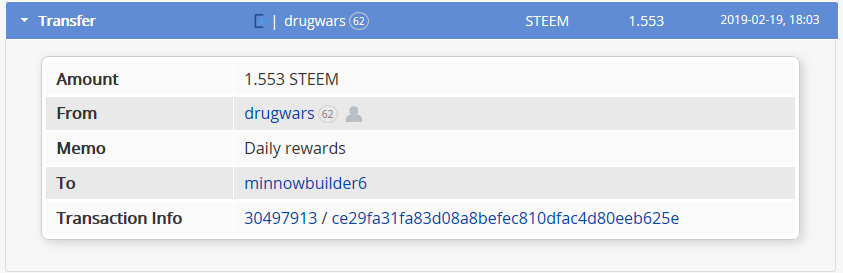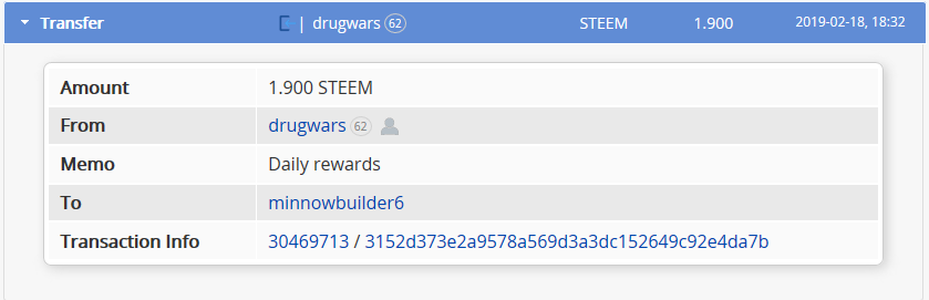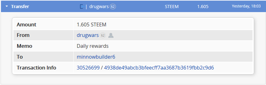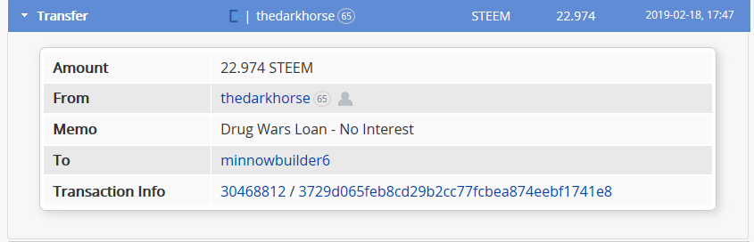 In case someone doesn't want to visit the other post, just know that we are using Drug Wars to build added value for the Minnow Builder program and not one fraction of a steem was pulled from the minnowbuilder account. Rather an interest free loan was given and is now being repaid from the earnings from Drug Wars.