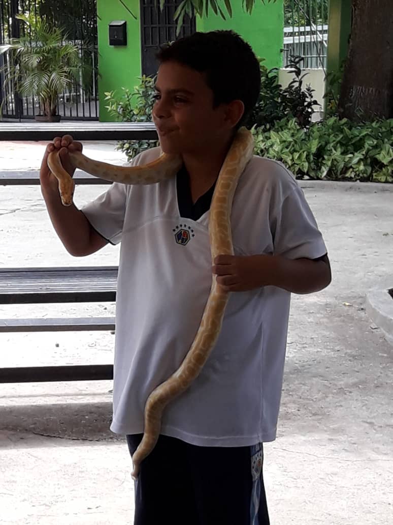 Al inicio sentian temor aunque muchos de ellos no habian tenido la oprtunidad de tenerlas tan cerca. Mi hijo fue uno de los valientes que se atrevio a agarrar una serpiente y colocarla sobre su cuello. Al inicio stab algo paralizado, pero luego se fue relajando.