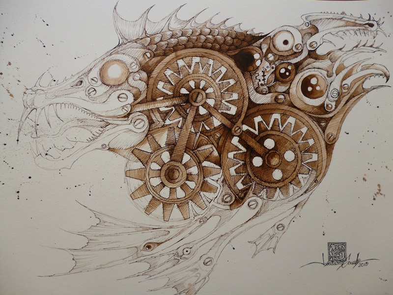 This is a step by step process description of a creative drawing inspired on anthropomorphic lacustrine characters, such as fishes, crustaceans, mollusks, reptiles and aquatic mammals. The figurative relations of the piece describe a series of aquatic beings or anthropomorphic characters, developed through drawing as a mean of graphic and gestural expression.