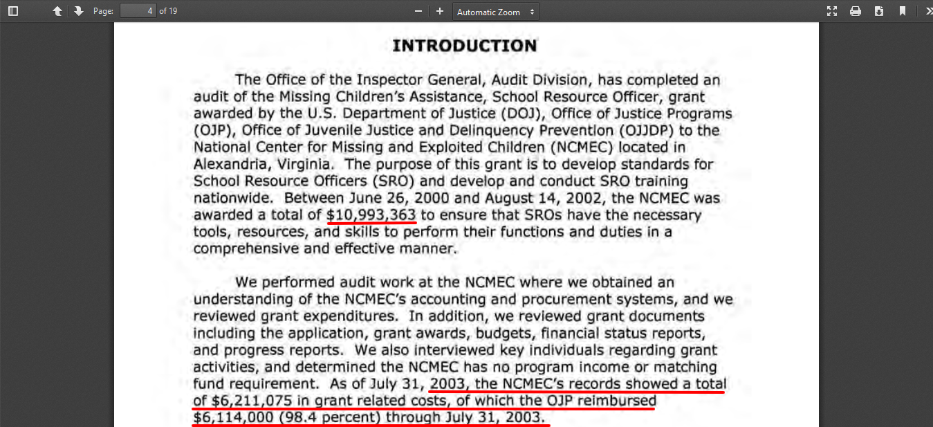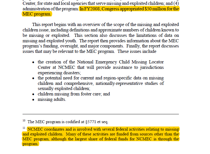 The 2008 CRS report released by Wikileaks in 2009, demonstrates that US government agencies throw money at the NCMEC even without receiving a request for funding.