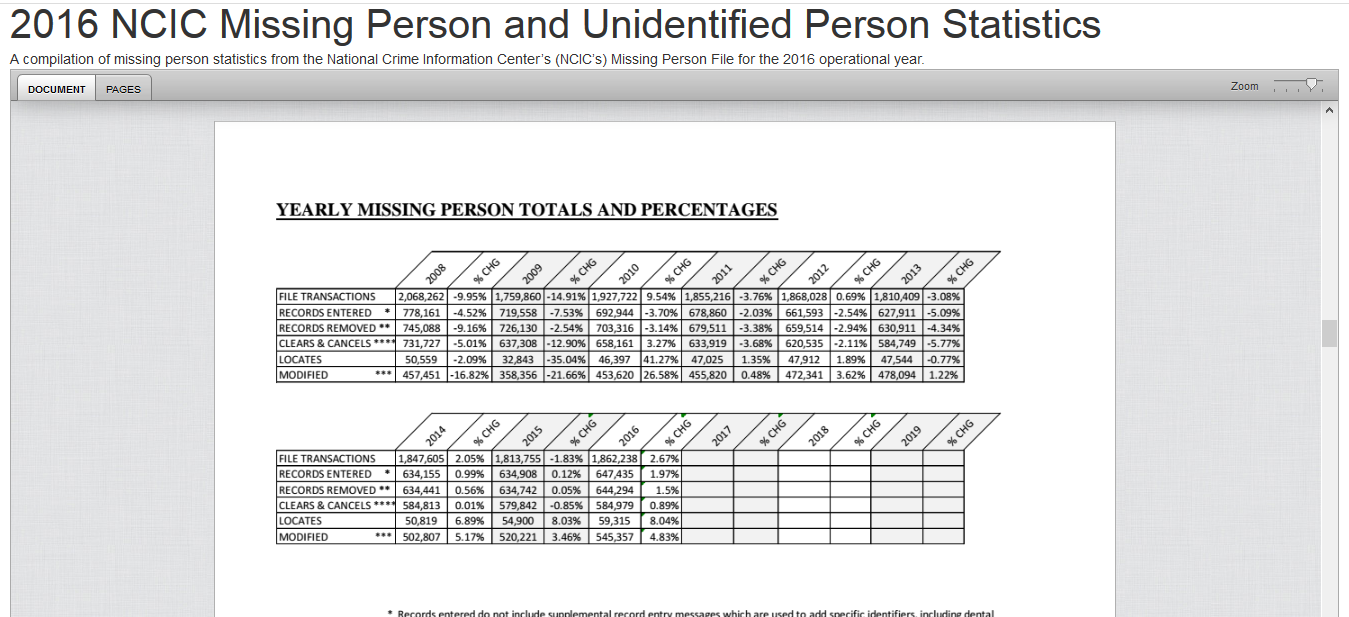 Finding reliable statistics on missing people (adults and children) is not an easy task. The FBI’s National Crime Information Center (NCIC) releases annual missing person and unidentified person statistics. However, the way in which the data is categorizes makes it difficult for the average person to make sense of.