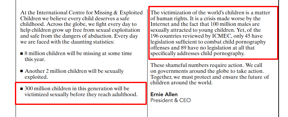 In the introduction for an ICMEC annual report, Ernie Allen (former CEO of NCMEC) states: