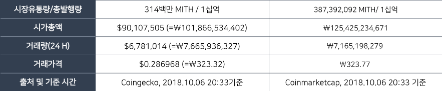 미스릴은 현재 국내에는 빗썸, 외국에는 LBank, OKEx, DigiFinex 등 위 이미지에 있는 다양한 거래소에 상장되어 거래가 이루어지고 있습니다. 코인마켓캡과 코인게코에서 미스릴을 검색해보면 아래와 같은 정보들을 확인 할 수 있으며, 현재 국내 거래소에서의 미스릴 가격은 320원입니다.
