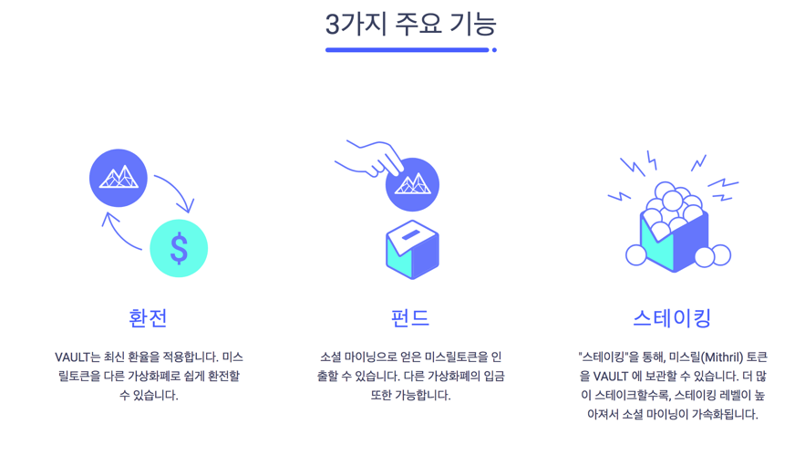 소셜 마이팅으로 얻은 미스릴 토큰을 인출하거나 다른 암호화폐로 전환이 가능한데, 이를 효율적으로 관리하기 위한 미스릴만의 만능 금고 기능을 제공합니다. 9월 20일 Mithril Vault 베타버전을 공개하였으며 소셜 마이닝 앱(Lit)와 연결하여 미스릴 토큰을 관리할 수 있습니다. (추가 내용은, https://mithvault.io/ko/faq에서 확인 가능)