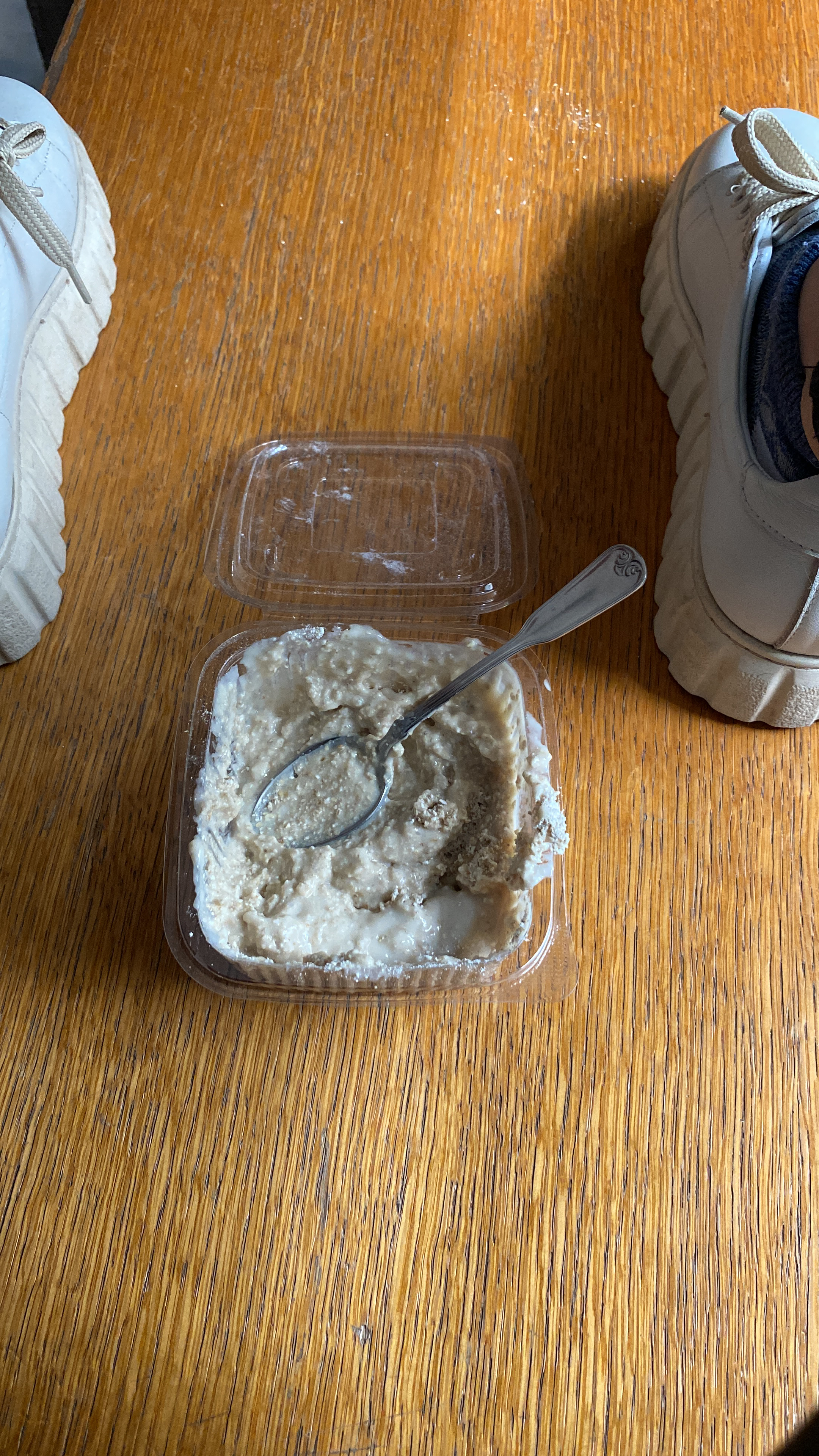 This was my breakfast this morning it’s oats with coconut protein pudding actually the pudding itself is so yummy and has a lot of proteins that I really need because I am into gym stuff but oats as healthy as they are I hate them they, just ruin every flavor so I was so struggling with eating all of that especially because when I’m on break I just need to eat it because I don’t know where to put it I just can’t put it like this in my bag because I do have books so I ate it but difficulty 😂