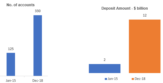 This is one of the largest financial inclusion actions taken by any government across the globe. Recognizing that a very large cross-section of the population in India was unable to participate fully into the economic activities of the country due to lack of access to banking, the Modi government took up the challenge in right earnest. Wasting no time PM Modi announced PMJDY from the ramparts of Red Fort in his Independence Day speech on 15th August 2014 (less than three months from taking the oath of office). And, set out a very ambitious target for getting people from the lower strata to open bank accounts. Results – by 26th Jan 2015 (India’s Republic day) i.e. in less than six months, more than 125 million accounts were opened with deposits of more than $ 2 billion then. Today, as of Dec 2018, the number of account holders has gone up to 335 million plus with deposits in excess of $ 12 billion.