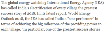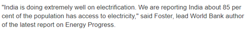 This was a daunting task even for a person like Modi. But undeterred, the Modi government plunged into the task, and, went ahead to announce that all households will be electrified by 2019. Bear in mind that the World Bank had themselves set a target of 2030 to achieve this milestone worldwide -Electricity for All. And here was India proposing to complete their part by 2019. Some nerve and commitment, one must say. Result – as of Dec 2018, almost 99% plus task has been completed with only about less than a million households remaining to be electrified (752,828 to be precise). And even these households are concentrated in only four states out of 29 – Rajasthan, Assam, Chattisgarh, and Meghalaya. Hats off to this stupendous achievement. No wonder, both the International Energy Agency and World Bank appreciated and recognized India’s tremendous effort. The World Bank report quoted below is dated May 2018. In the period since then, about 7 months, the figure of 85% has moved up to 99% plus, well on the path to achieving the target of 100% by 31st March 2019.