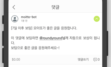 마지막 이미지를 보면 댓글이 하나 보입니다. 이 댓글이 바로 7일이후 보팅의 비결입니다. 모이또에서 보상이 끝난 글에 보팅을 하면 자동으로 모이또 봇이 댓글을 달고, 여기에 보팅을 하게 됩니다. 그 뒤에 이 댓글에 대한 보상이 글의 주인에게 돌아가게 되는 원리입니다.