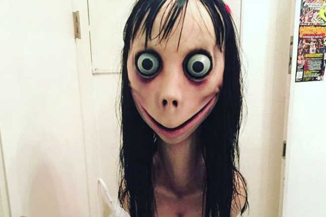 The image of 'The Momo Challenge' is an image of a creepy doll called ‘Mother Bird with bulging eyes and a wide mouth.