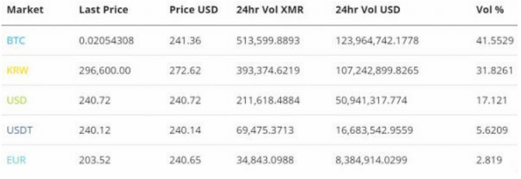 XMR trading volume has been led by Bitcoin (BTC), Korean Won (KRW) and the United States Dollar (USD) peers on Poloniex, Bithumb, and Bitfinex respectively. The KRW peer holds a large premium, and is currently typical with all crypto assets. This is likely to restrictive banking policies which make it difficult to arbitrate.