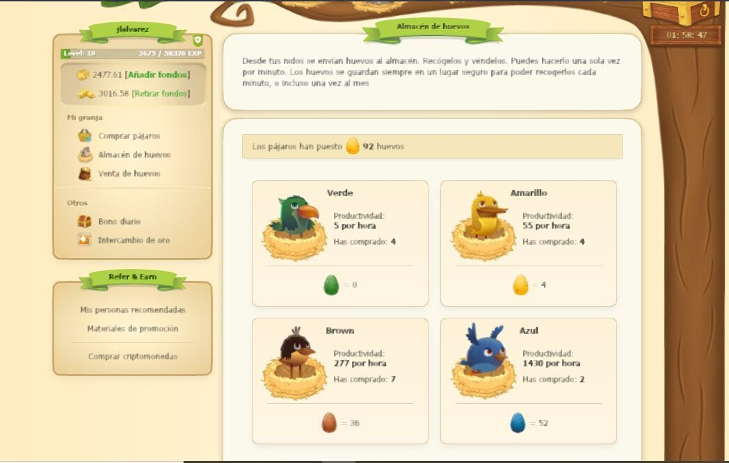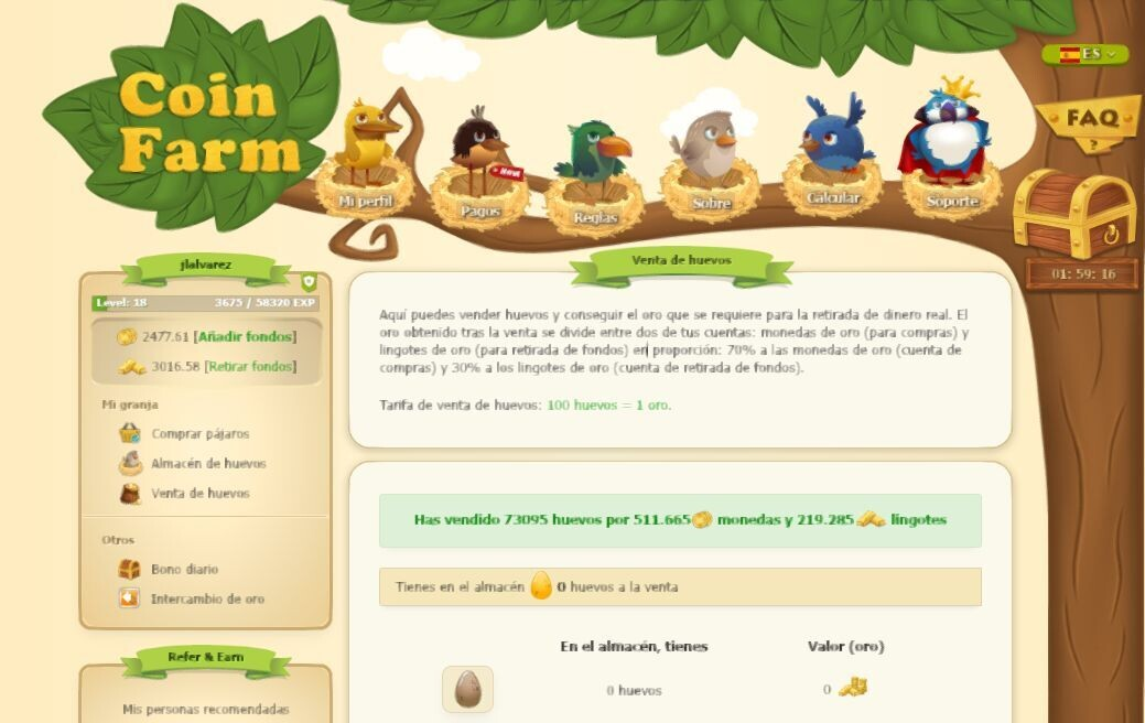 Una plataforma Divertida que aloja ciertas avesitas que colocan sus huevos, los que tienes que vender por una moneda comercial que puedes cambiar a tu moneda local.
