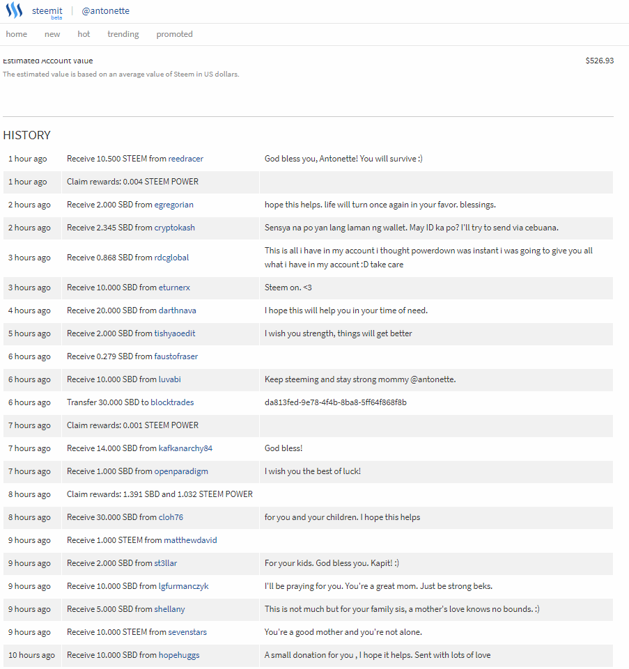 Here is a screenshot of the two pages worth of SBD donations directly gioven to @antonette after she asked for some Help to pay her rent and pay for medicine and healthcare for her children with chicken pox, showing images of her children which helps to garner sympathy, a strategy I have proposed even starving families do in order to prove the desperateness pof their situation!