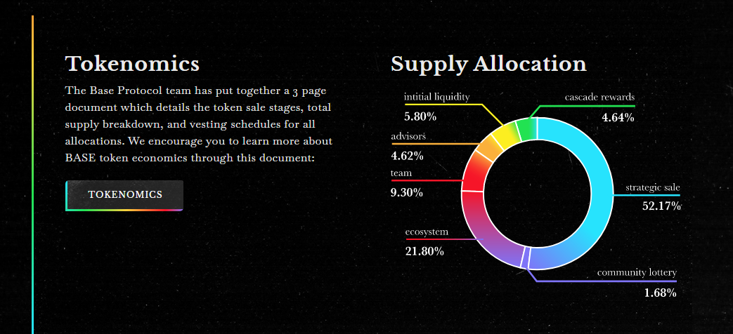 Base users will have the option to purchase BASE at its Uniswap liquidity pool. The Base Cascade rewards users who stake their BASE in the liquidity pool. The Cascade issues rewards based on how long a user stakes their tokens in the pool – where the pool is shared based on the quantity and longevity of the liquidity provided