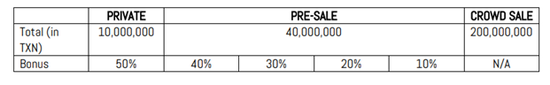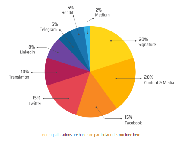 3% of the tokens (15,000,000 TXN) will be used for a bounty program. 7,000,000 TXN is allocated for commission, 3,000,000 TXN for affiliate links, and 5,000,000 TXN is for the bounty detailed below.