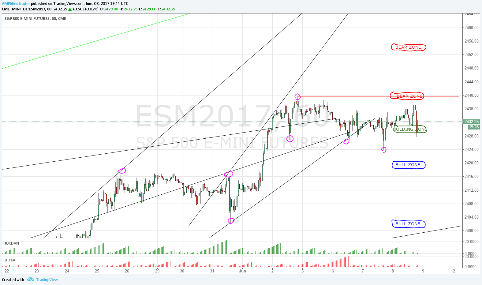 ESM 6/8/17amplifiedtrader (36)in #money • 9 years ago (edited) Still needing to cleanly escape the 2430 level. Yet another day with the same "Holding Zone" aka pivot. Expecting to see more volatility today compared to past few trading days with it being #Comeyday and all. The Result: #finance #news #trading #comeyday