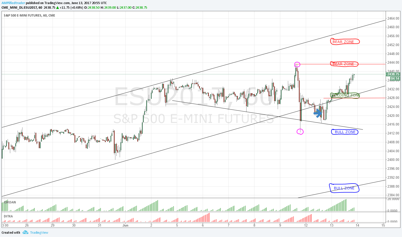 2-day Fed meeting begins today. 100% chance that Fed raises overnight rate by 0.25%, all priced in already. Rate hike cycles are bullish for stocks (when inflation is "in check") so continued bullish bias with the indices. Holding zone = pivot. Looking for price to escape its hold. Yesterday's cash gap now closed. A cash open today closest to unchanged is more bullish than another gap open, from an intraday perspective.