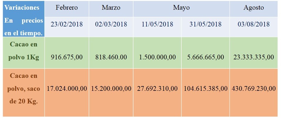 Para fundamentar el índice de inflación sin profundizar mucho en términos financieros, muestro en la siguiente tabla datos reales en la variación de los precios en los productos, entre los meses de febrero del 2018 hasta agosto del 2018, quise tomar como ejemplo los precios del cacao en polvo por tener a la mano las referencias de los precios con respecto a sus fechas de incremento, pudo ser cualquier otro producto. Sabemos que el ejemplo aplica porcentualmente al PIB.