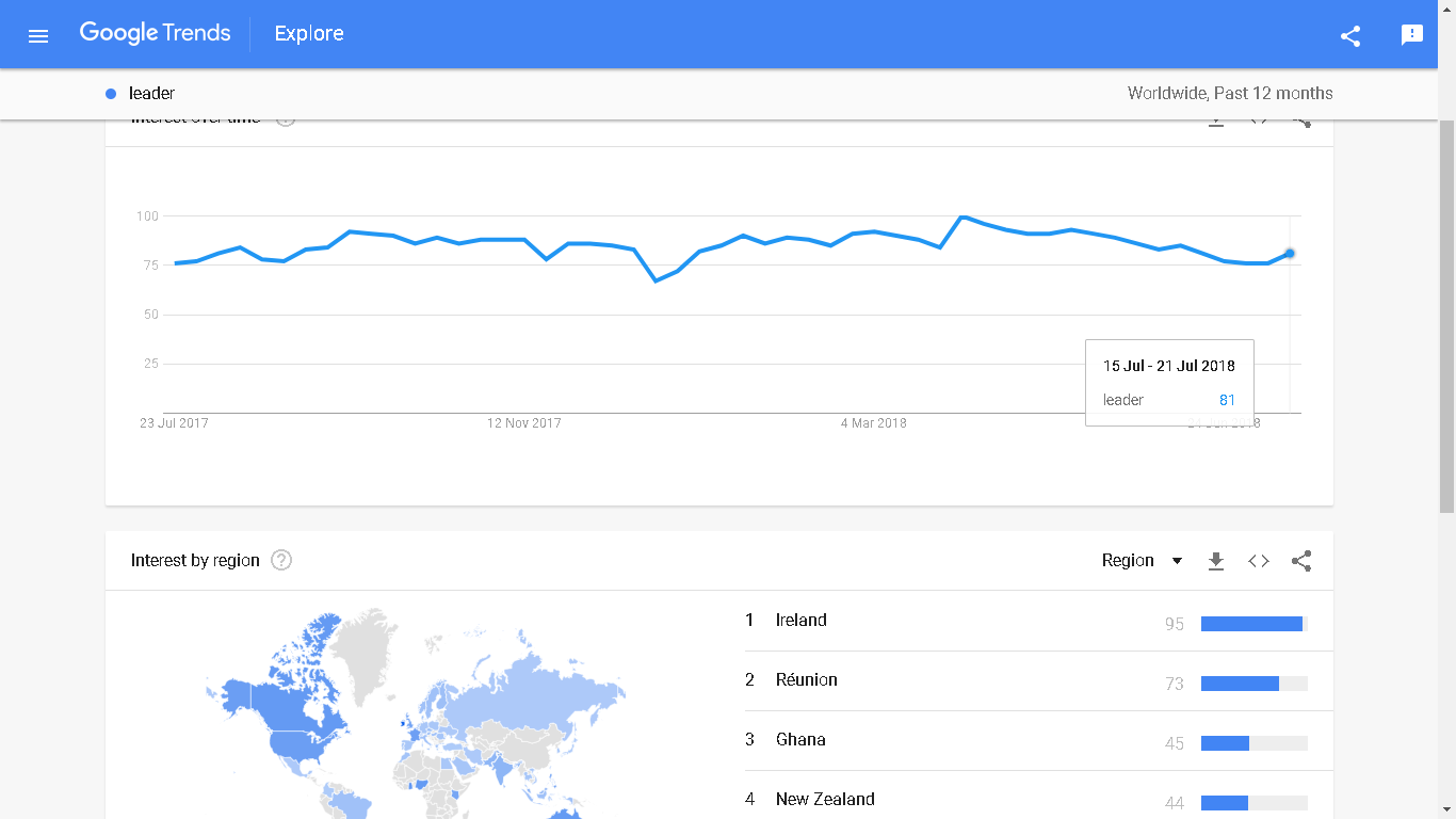 You can see the graph below of world wide leaders. Numbers represent search interest relative to the highest point on the chart for the given region and time. A value of 100 is the peak popularity for the term. A value of 50 means that the term is half as popular. A score of 0 means that there was not enough data for this term.