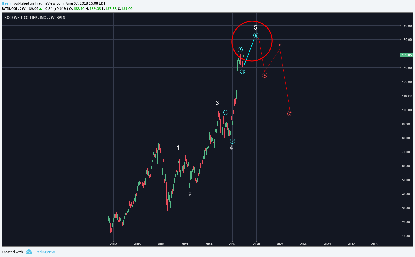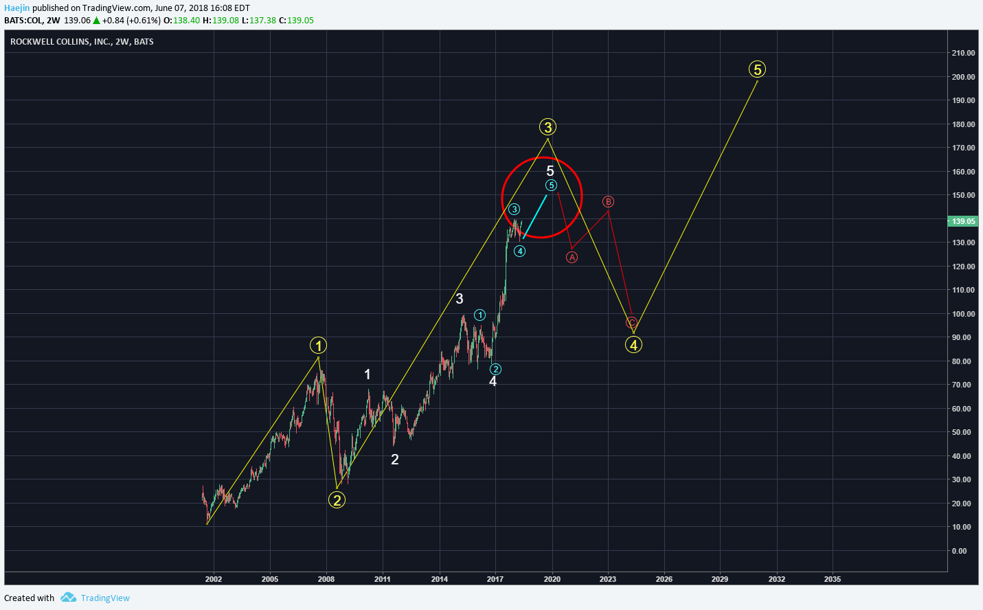 This chart of Rockwell Collin (COL) at first site might seem scary but fear can often be dispelled by awareness. So, let's tackle the red halo event first. Yes, there is an impulse of five waves that will complete and there is a scenario that it could already be complete. Once five waves are in, Elliott Waves states that there is a requisite correction.