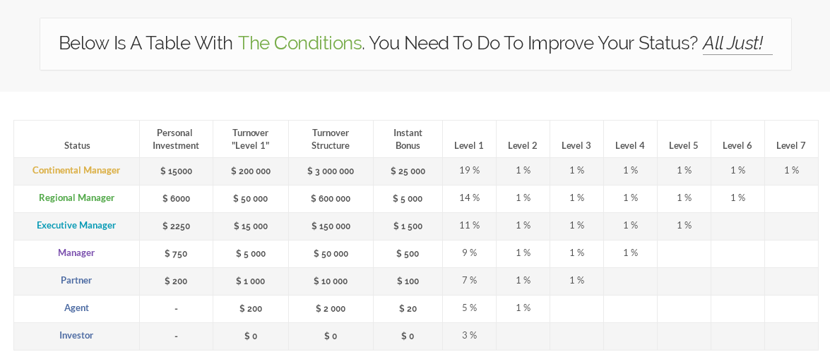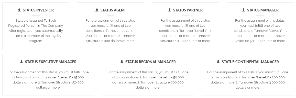 Only 7 statuses: Investor, Agent, Partner, Manager, Executive Manager, Regional Manager and Continental Manager.