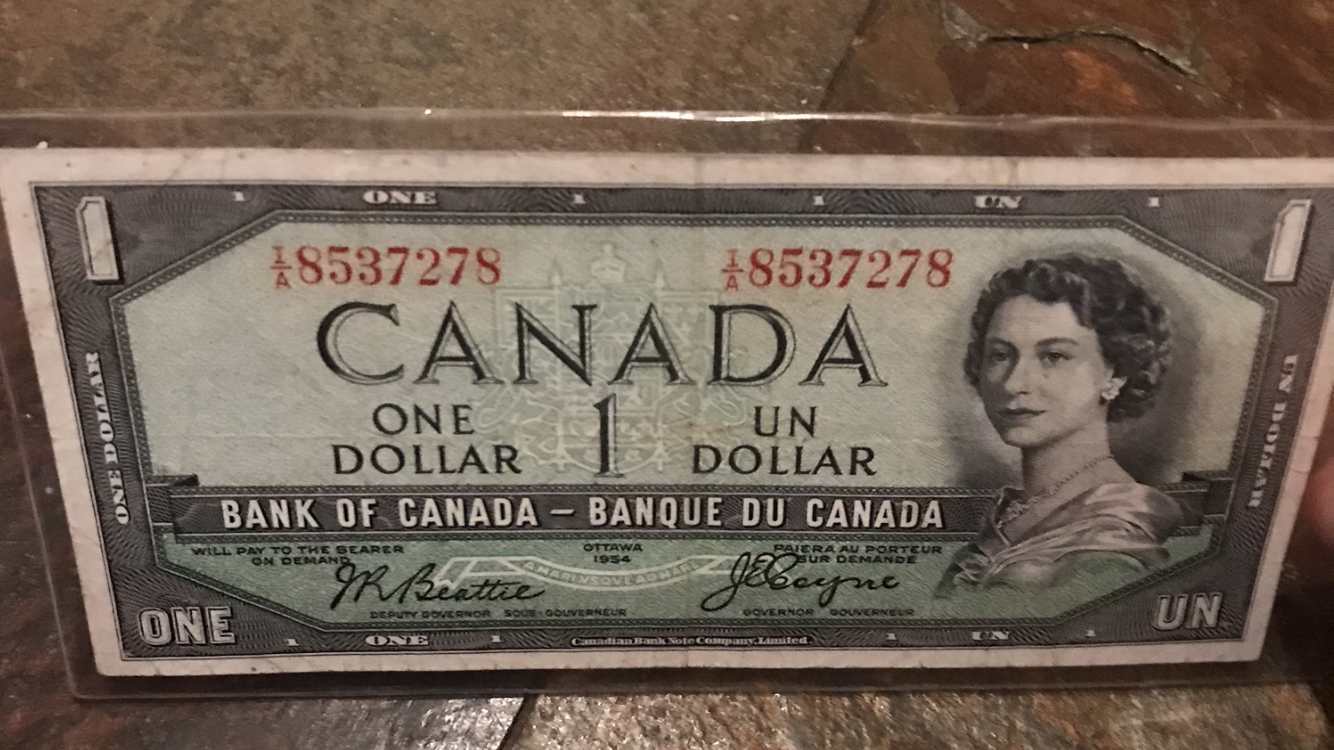 This is one of my favorite bank notes in my collection. It is a 1954 Canadian $1 bill.