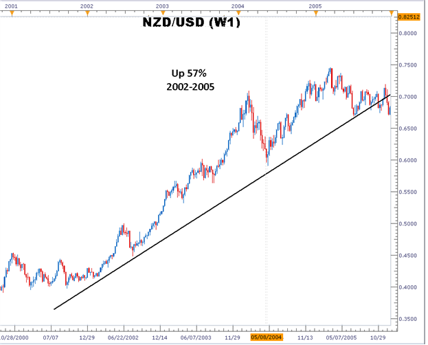 In the above example, as the Reserve Bank of New Zealand continued to raise interest rates, the NZDU dollar rose 57%. From 2002 to 2005, RBNZ raised interest rates from 4.75% to 7.25%, while the Fed raised them from 1.73% to 4.16% over the same period. Investors seeking higher returns earn NZD with lower yield dollars for higher yields. As a result, NZDU US dollar rose 57%.