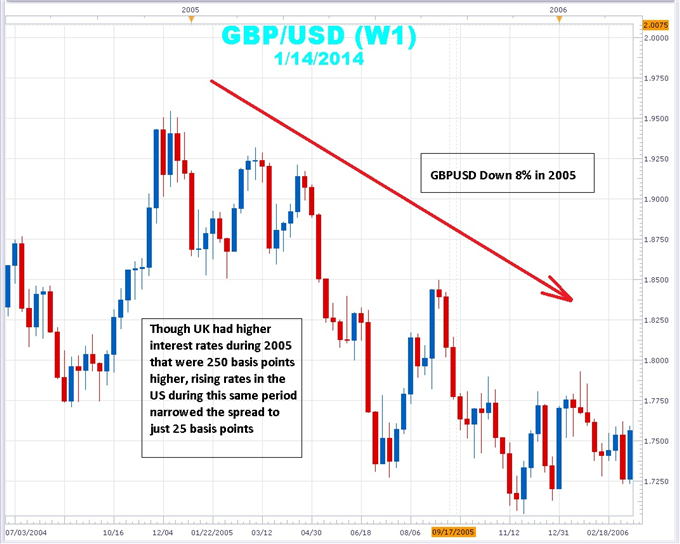 For example, interest rates in Britain range from 4.5 to 4.75%, much higher than that in the United States by 3.25%. Traditional wisdom will decide that the pound should appreciate against the US dollar over that time. However, as shown above, this is obviously not the case, because the pound fell against the US dollar. The reason is that the Federal Reserve will start tightening interest rate cycles. In early 2005, the 250 base point premium in Britain narrowed to just 25 basis points. The Fed raised interest rates from 3.25% in December 2004 to 6% in May.