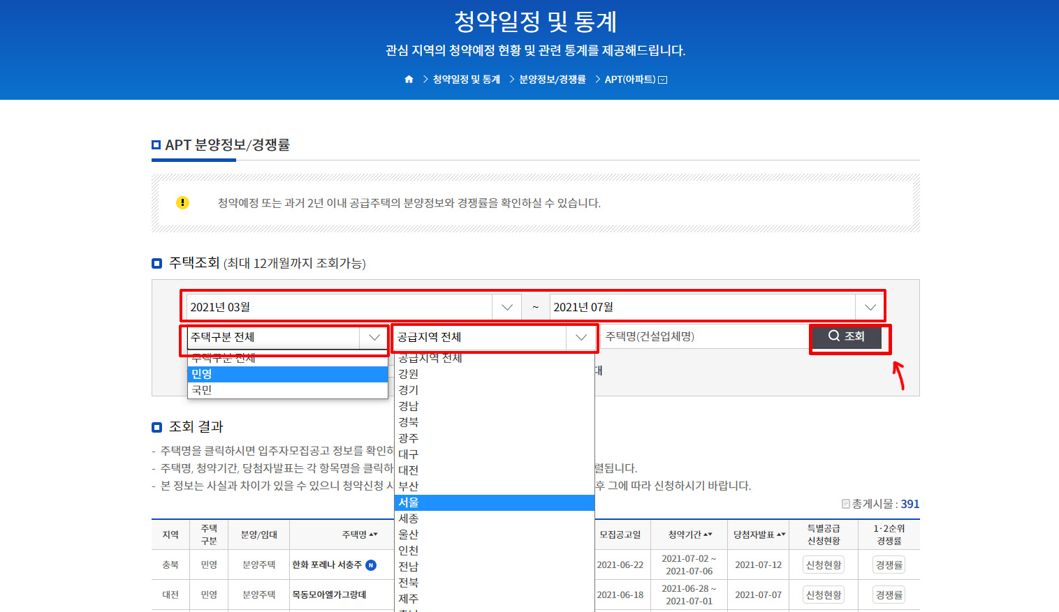 (4) 내가 사는 지역에서 청약가능한 일정을 조회해보자