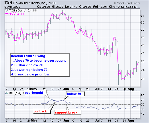 A bearish failure swing forms when RSI moves above 70, pulls back, bounces, fails to exceed 70 and then breaks its prior low. It is basically a move to overbought levels and then a lower high below overbought levels. Chart 8 shows Texas Instruments (TXN) with a bearish failure swing in May-June 2008.