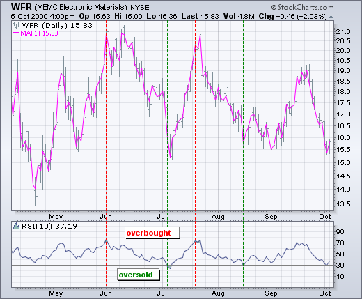 Like many momentum oscillators, overbought and oversold readings for RSI work best when prices move sideways within a range. Chart 4 shows MEMC Electronics (WFR) trading between 13.5 and 21 from April to September 2009. The stock peaked soon after RSI reached 70 and bottomed soon after the stock reached 30.