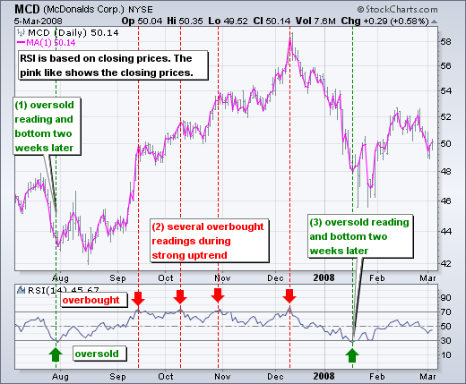 Wilder considered RSI overbought above 70 and oversold below 30. Chart 3 shows McDonalds with 14-day RSI. This chart features daily bars in gray with a 1-day SMA in pink to highlight closing prices because RSI is based on closing prices. Working from left to right, the stock became oversold in late July and found support around 44 (1). Notice that the bottom evolved after the oversold reading. The stock did not bottom as soon as the oversold reading appeared. Bottoming can be a process. From oversold levels, RSI moved above 70 in mid September to become overbought. Despite this overbought reading, the stock did not decline. Instead, the stock stalled for a couple weeks and then continued higher. Three more overbought readings occurred before the stock finally peaked in December (2). Momentum oscillators can become overbought (oversold) and remain so in a strong up (down) trend. The first three overbought readings foreshadowed consolidations. The fourth coincided with a significant peak. RSI then moved from overbought to oversold in January. The final bottom did not coincide with the initial oversold reading as the stock ultimately bottomed a few weeks later around 46 (3).