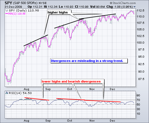 Before getting too excited about divergences as great trading signals, it must be noted that divergences are misleading in a strong trend. A strong uptrend can show numerous bearish divergences before a top actually materializes. Conversely, bullish divergences can appear in a strong downtrend - and yet the downtrend continues. Chart 6 shows the S&P 500 ETF (SPY) with three bearish divergences and a continuing uptrend. These bearish divergences may have warned of a short-term pullback, but there was clearly no major trend reversal.