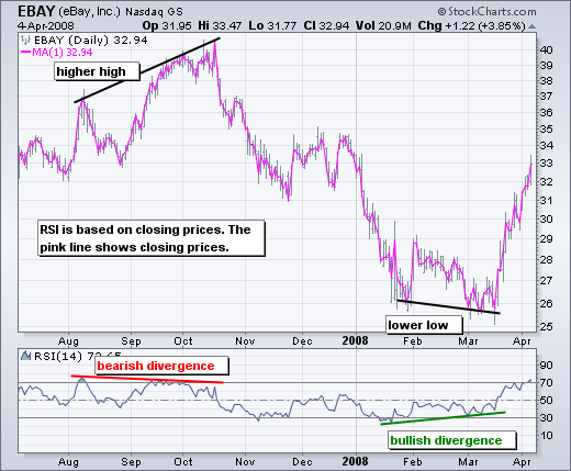 According to Wilder, divergences signal a potential reversal point because directional momentum does not confirm price. A bullish divergence occurs when the underlying security makes a lower low and RSI forms a higher low. RSI does not confirm the lower low and this shows strengthening momentum. A bearish divergence forms when the security records a higher high and RSI forms a lower high. RSI does not confirm the new high and this shows weakening momentum. Chart 5 shows Ebay (EBAY) with a bearish divergence in August-October. The stock moved to new highs in September-October, but RSI formed lower highs for the bearish divergence. The subsequent breakdown in mid October confirmed weakening momentum.