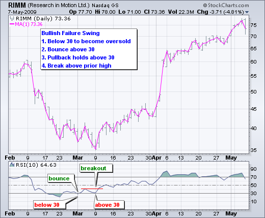 Wilder also considered failure swings as strong indications of an impending reversal. Failure swings are independent of price action. In other words, failure swings focus solely on RSI for signals and ignore the concept of divergences. A bullish failure swing forms when RSI moves below 30 (oversold), bounces above 30, pulls back, holds above 30 and then breaks its prior high. It is basically a move to oversold levels and then a higher low above oversold levels. Chart 7 shows Research in Motion (RIMM) with 10-day RSI forming a bullish failure swing.