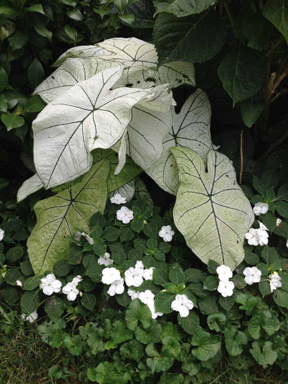 OK, the flowers are secondary to the leaves in this shot, but this is my submission for @brumest’s #monomad Friday flowers theme. I don’t know what these are called (elephant ears maybe?), but I do like the contrast of the dark veins in the leaves, especially in high contrast black and white. The original color shot from my phone is below though, so tell me if you agree.