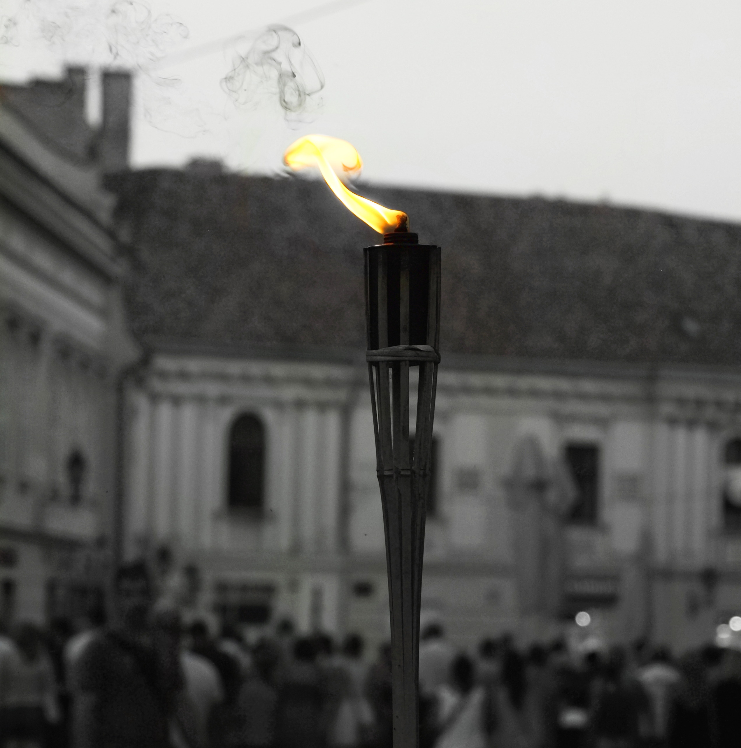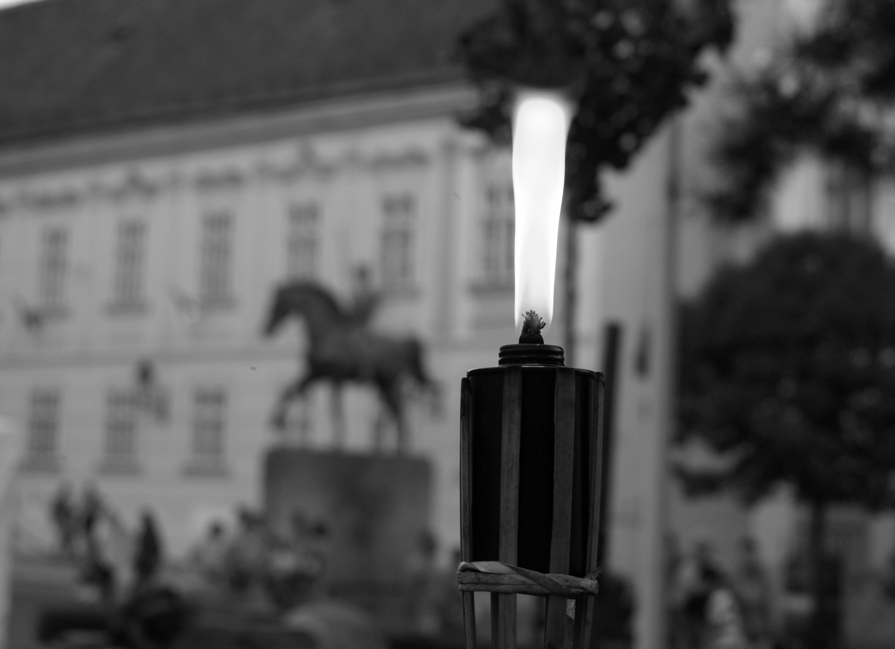 I have something special for you! I was fascinated by the flame of the torch, so I focused on the light and let streetview blurred in the background. Taken in Székesfehérvár downtown.