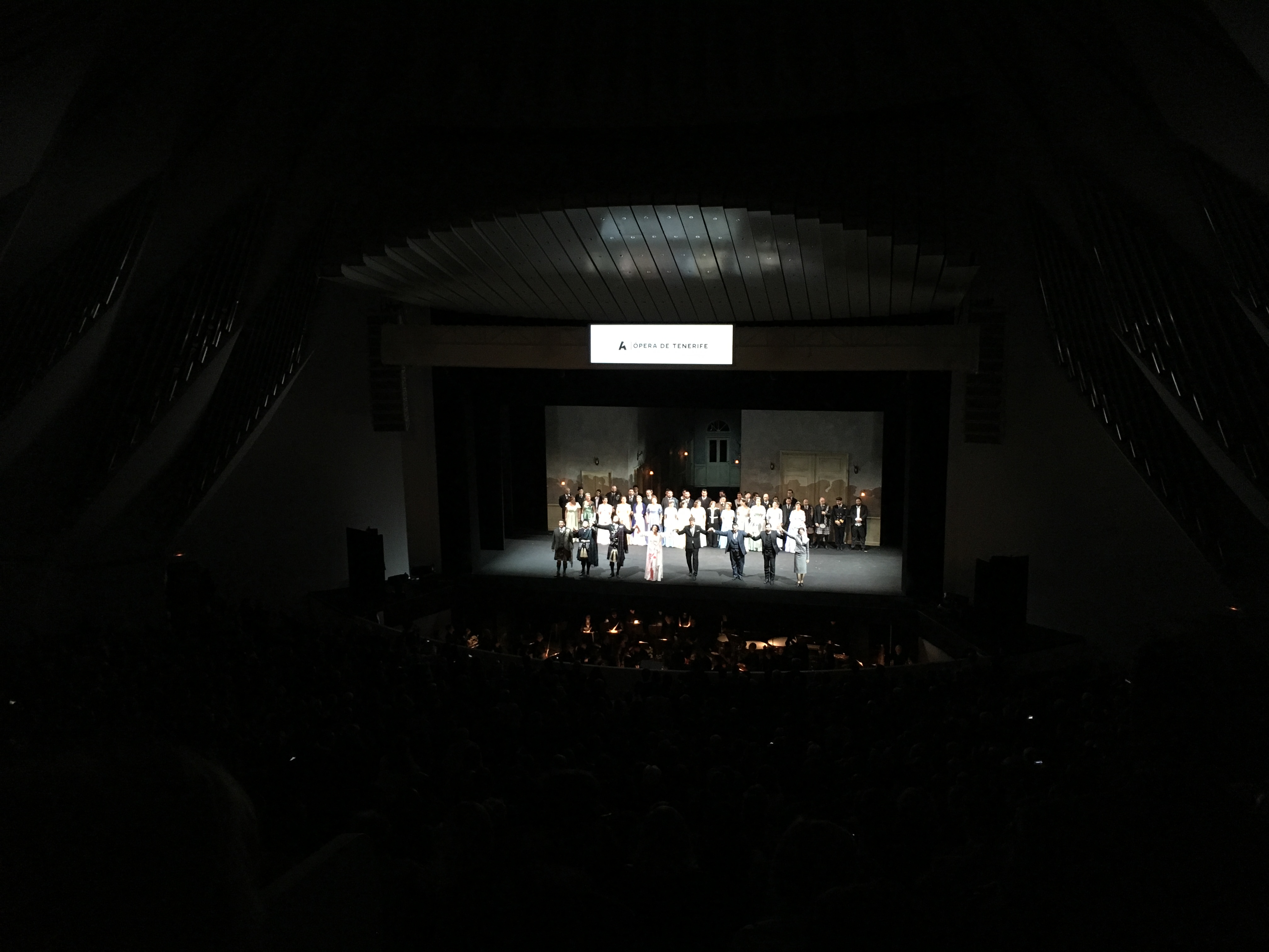 El sábado fui a la ópera. En los momentos previos a la representación hice esta foto del interior del Auditorio de Santa Cruz de Tenerife. Este edificio, obra de Santiago Calatrava, es muy bello tanto en su fachada exterior, como del interior y zona escénica. Sobre la platea hay una cúpula cónica muy alta. Desde arriba, una fuerte luz cenital extiende su iluminación, como una explosión, hacia las paredes laterales. No se porqué, pero me recuerda a la representación del Espíritu Santo. Quizás, el arquitecto quería sugerir que algo divino y trascendental allí iba a suceder.
