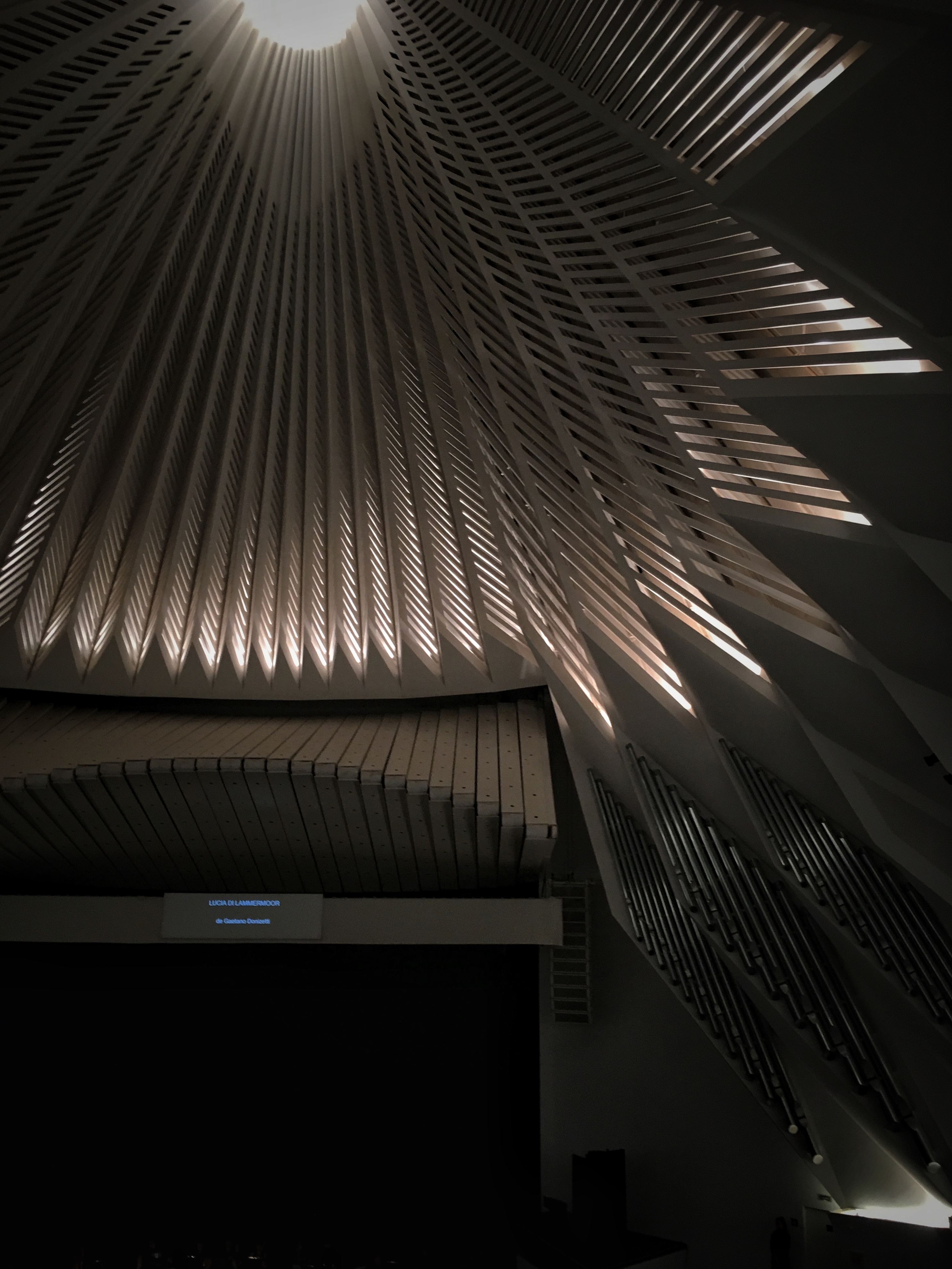 On Saturday I went to the opera. In the moments before the performance I made this photo of the interior of the Santa Cruz de Tenerife Auditorium. This building, work of Santiago Calatrava, is very beautiful in its exterior facade, as well as in the interior and scenic area. On the stalls there is a very high conical dome. From above, a strong overhead light extends its illumination, like an explosion, towards the side walls. I do not know why, but it reminds me of the representation of the Holy Spirit. Perhaps, the architect wanted to suggest that something divine and transcendental would happen there.