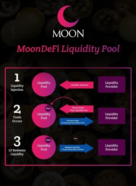 The participants in MoonDefi Exchange contribute/lend tokens to a Liquidity pool created by the company. These contributors are regarded as Liquidity providers, and they are rewarded MOON tokens (which is the official token of the project) for their contributions to the pool. Token's exchanges are done within the LP by the users with a fee charge of 0.03%. The Liquidity providers can withdraw their tokens anytime by depositing its equivalent value in the pool.