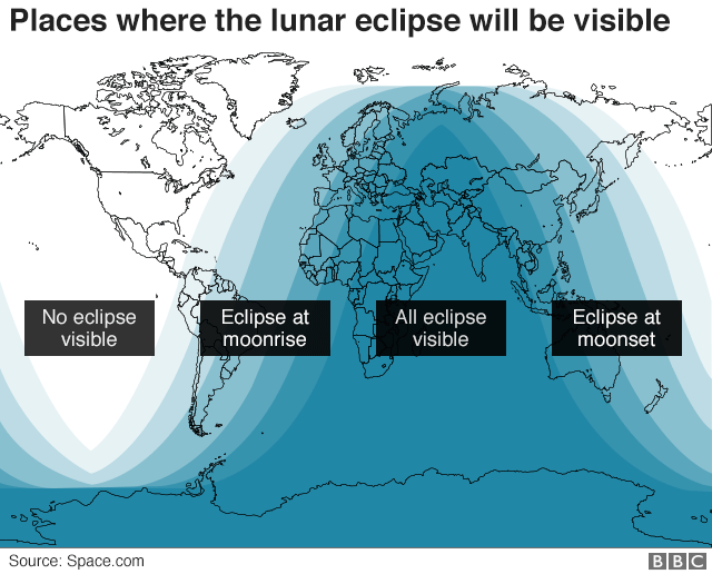 will last for one hour, 43 minutes. At least part of the eclipse is visible from Europe, the Middle East, Africa, Australia, most of Asia and South America. In the UK, rain clouds permitting, the Moon will appear entirely red - fully eclipsed by Earth - from when it rises at 21:00 to 22:15 BST.