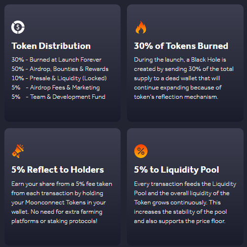 By attaining at least 5.000.000 holders, Moonconnect intends to become the most decentralized and evenly distributed token in the universe! And over 70% of the circulating supply would be distributed via Airdrops, Bounties, and Rewards at random.