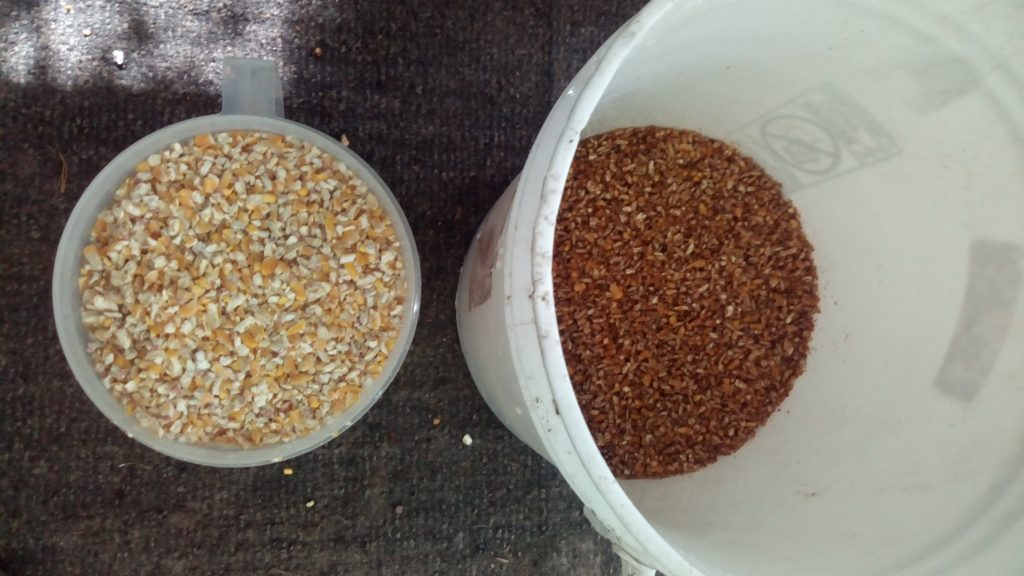 While waiting for the water to come to temperature put one part sweet feed to 2 parts corn in a 5 gallon bucket until its full. I use a one-gallon scoop so it doesn’t take as long. Set aside until the water reaches 160f