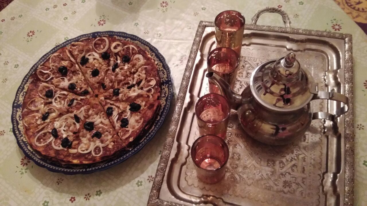 يُقطّع الطماطم والبصل إلى شرائح ويتبل بالملح والفلفل.