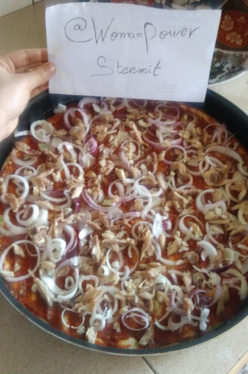 Spread the dough, spread it with cream then arrange the tomatoes, onions and tuna and sprinkle with the grated cheese, drizzle with olive oil.