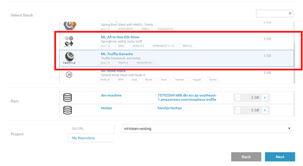 저는 간단히 리뷰해볼 목적이므로 ML-Truffle-Ganache를 선택하여 Truffle만 사용해보도록 하겠습니다. Truffle을 선택한 후 아래 Project에서 My repository를 클릭하여 이전에 선택한 예제를 선택하도록 합시다. Next를 누르면 맨 처음 제가 만든 사설 네트워크를 선택할 수 있습니다.