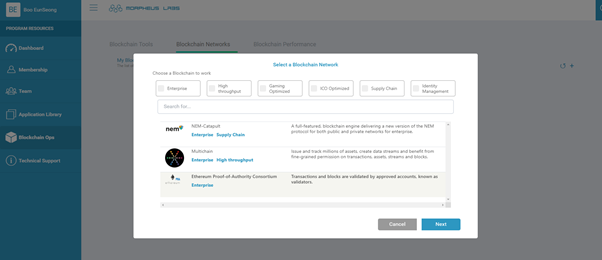 소스코드가 생성 되었으니 이를 동작시킬 네트워크가 필요합니다. 모피우스 랩에서 Blockchain OPS 메뉴로 접속하여 Blockchain network를 새로 생성시켜줍시다.