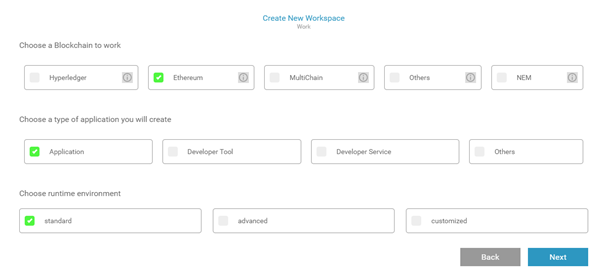 다음 화면으로 넘어가면 이 플랫폼의 가장 강력한 기능이 나타나게 됩니다. 즉 개발 환경의 스택을 설정할 수 있습니다. 아래 그림에서 보는 것과 같이 일반적으로 스마트 컨트랙을 개발하고 테스트할 때 가장 많이 쓰이는 개발 툴인 Truffle을 선택하 실 수도 있고, 스마트 컨트랙을 호출하거나 블록체인 네트워크와 어떠한 상호작용을 하기 위한 스마트폰, 웹 앱을 만들고 싶을 경우 Web3j라이브러리를 이용해야 하므로 “ML-Spring-Boot-Web3J-Starter”를 선택하실 수도 있습니다. 즉 자신이 블록체인 네트워크와 통신할 어플리케이션을 개발할 건지, 스마트 컨트랙만을 개발하고 테스트할 건지, 아니면 앱과 스마트 컨트렉트 전체를 다루는 하나의 서비스를 만들건지에 따라 스택을 설정하시면 됩니다. 전체 서비스를 만들 경우 truffle, web3j 이 포함된 ML-All-In-One-Eth-Silver를 통해서 쉽게 개발할 수 있습니다.
