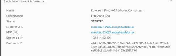 완료된 이 후 물음표를 클릭하면 아래와 같은 화면이 나옵니다. 우리는 아래의 RPC url을 통해 방금 만든 네트워크의 노드에게 호출을 날려 스마트 컨트랙트를 호출하거나 트랜잭션을 보내는 등 노드와 여러 상호작용을 할 수 있습니다.
